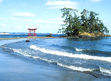 恋路海岸は、能登町の北に位置する美しい海岸で、沖には鳥居を構えた弁天島が浮かんでいます。